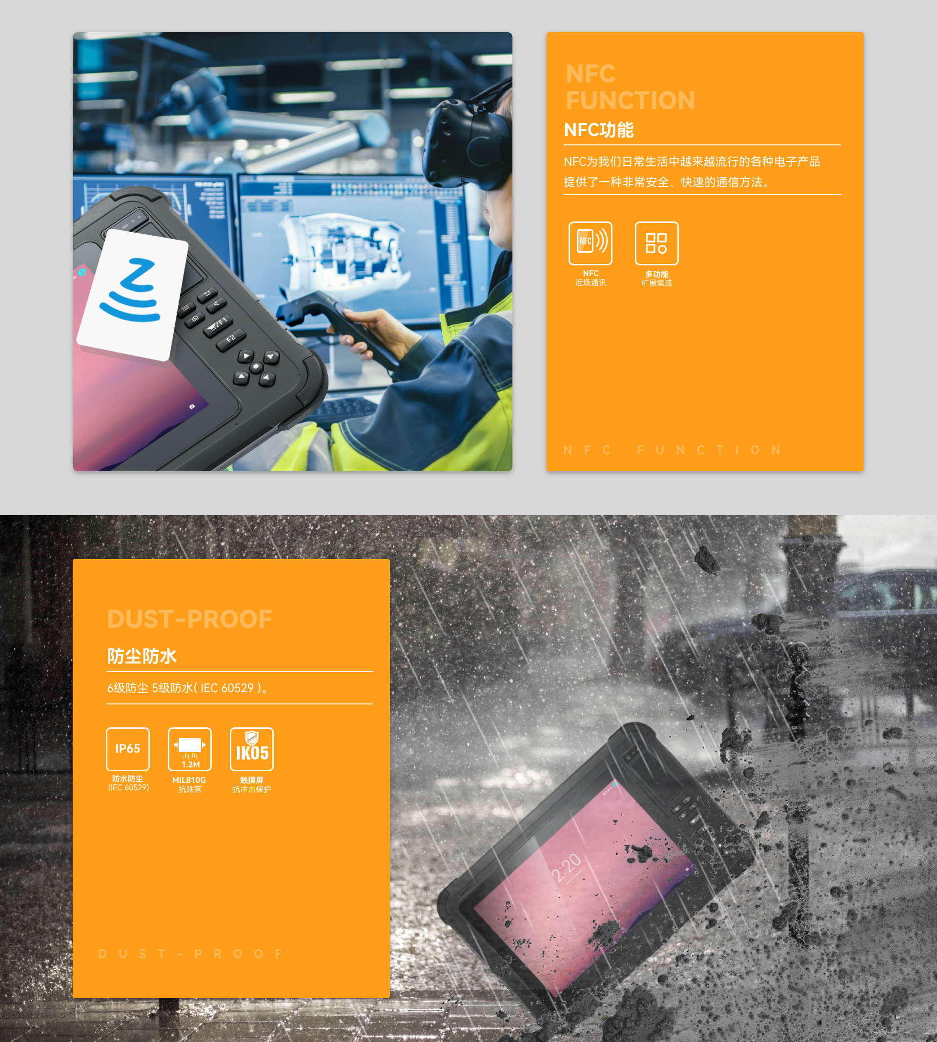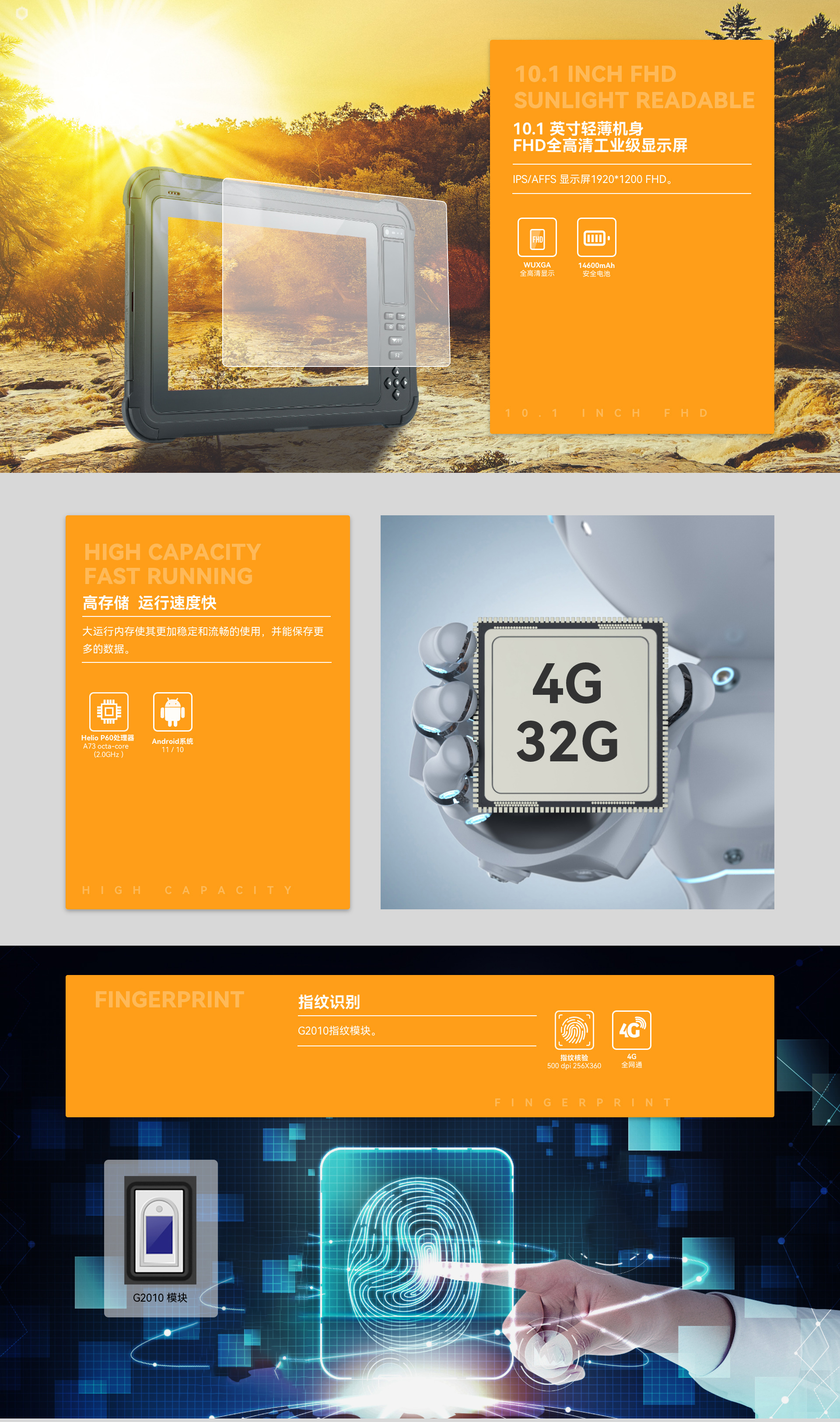 S9是一款拥有多功能数据采集的RFID三防平板电脑。支持RFID标签读写与NFC应用。S9外观设计实用,便携易带,运用10.1英寸G+G5点全钢化高强度电容触摸屏。产品采用领先的工业级防护,达到IP67密封标准。具有抗最高1.8m高度跌落的可靠性能,跌落防护符合MIL-STD-810G/Method516.6/ProcedureIV的军用保护等级。采用14600mAh高电压大容量锂电池,续航时间超长,为工作提供更有力的支持。速度最快的WIFI通信,保证速度传输的效率。