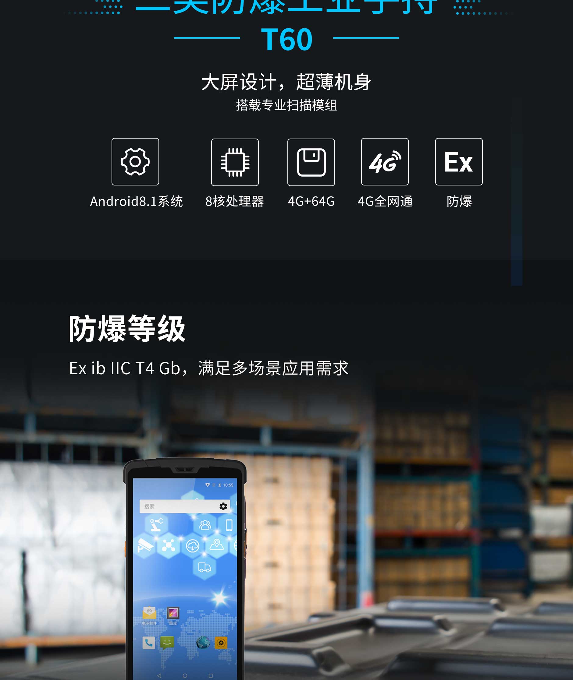 T60-EX工业级防爆手持终端通过防爆强制认证(防爆标志Exib II CT4),符合国标 GB3836.1/GB3836.4的防爆要求。T60-EX可广泛应用于一区、二区等易燃易爆、危化品环境。在石油、化工、冶炼、天然气,危险品运输等行业得到大量应用