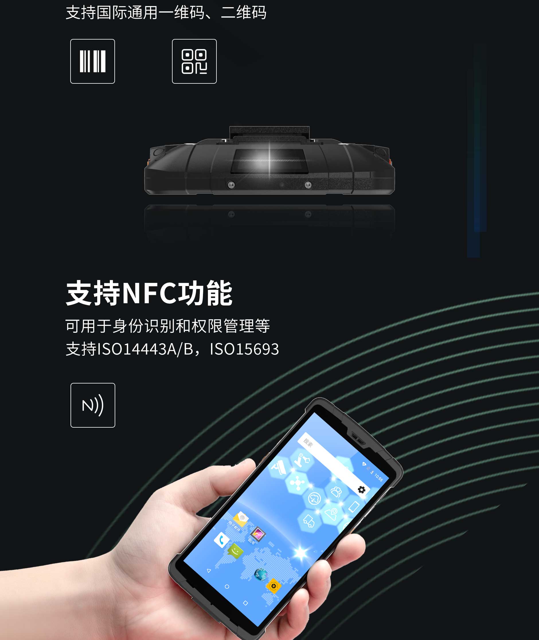 | NFC | 支持协议:ISO14443A/B,ISO15693,读取距离:0~5cm |